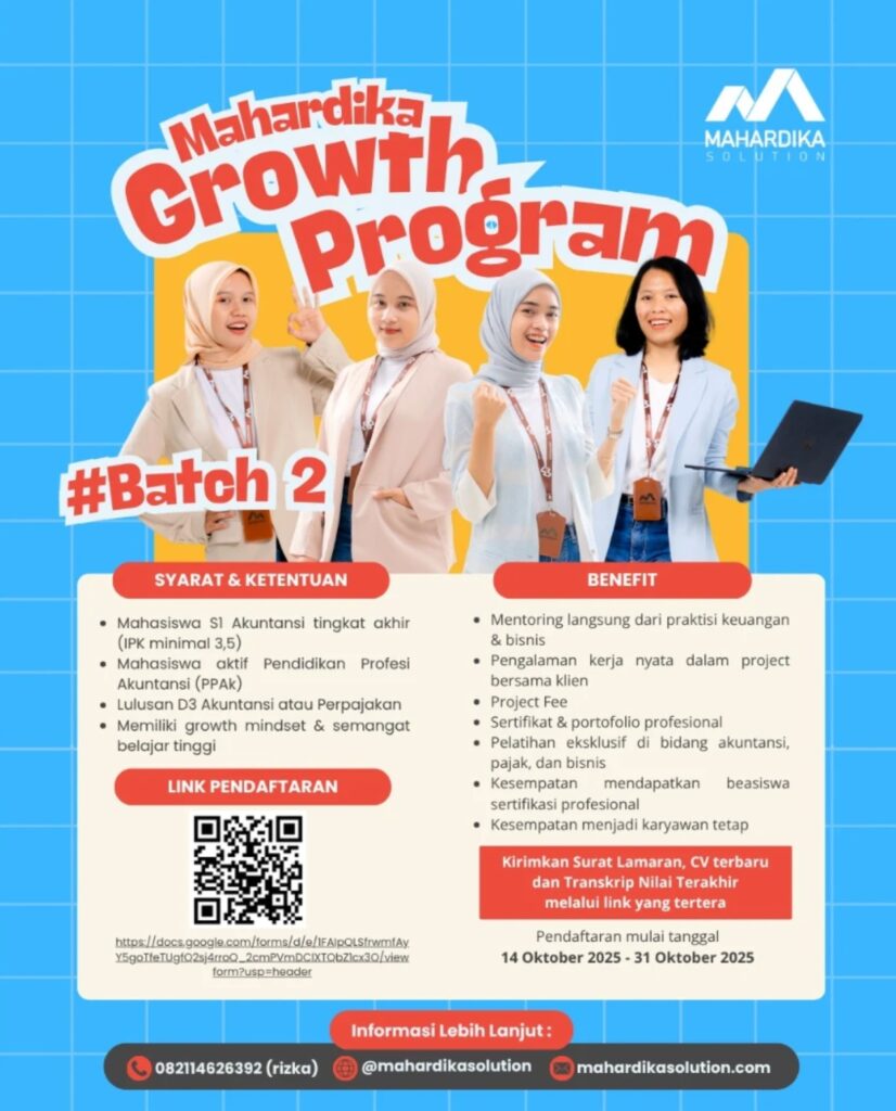 MAHARDIKA GROWTH PROGRAM (MGP) BATCH 2 SUDAH DIBUKA!!! 🌟 Paid Internship & Mentoring 🌟 MAHARDIKA GROWTH PROGRAM (MGP) adalah program paid internship dan mentoring profesional dari Mahardika Solution yang dirancang untuk membekali peserta dengan keterampilan praktis di bidang akuntansi, pajak, keuangan, dan sistem informasi bisnis. Dapatkan pengalaman langsung, fee per project, serta akses ke pelatihan […]