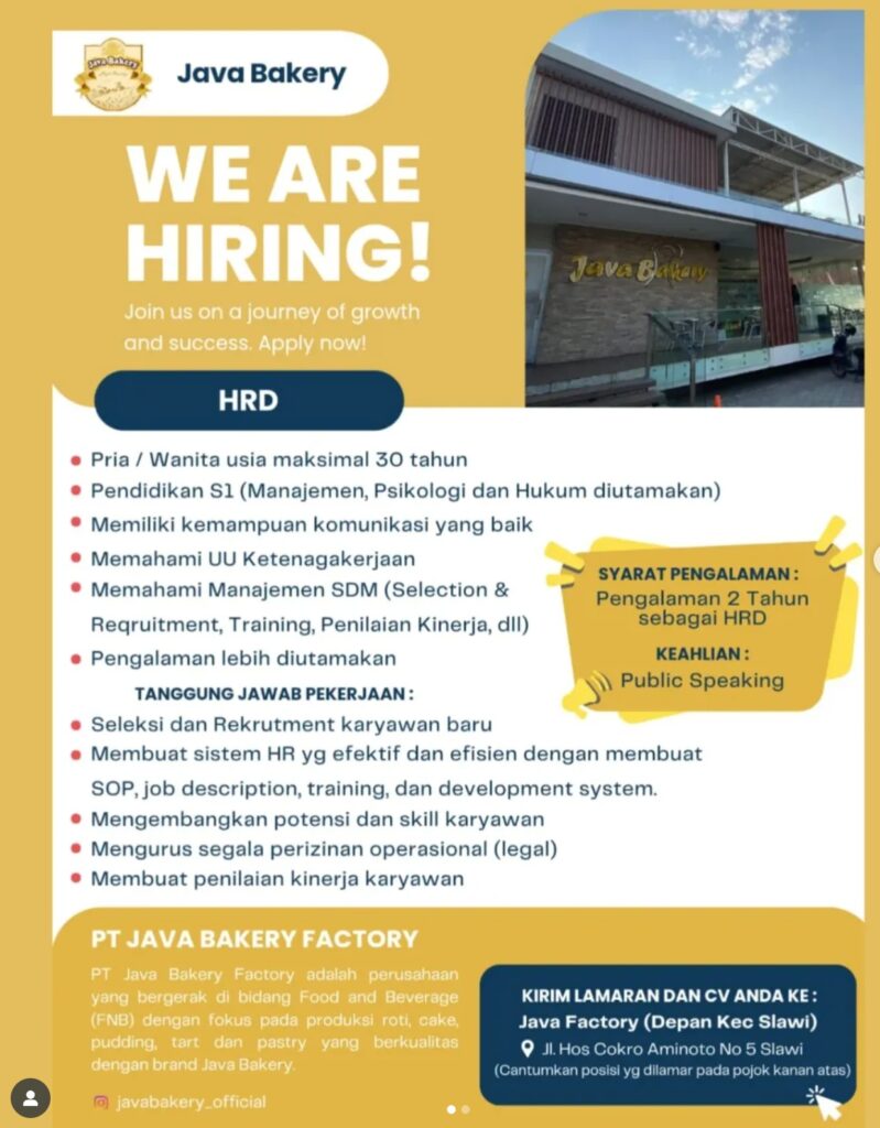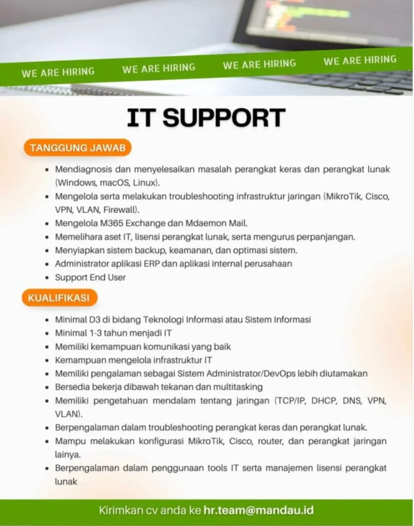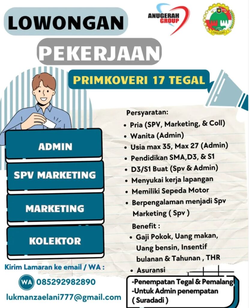PERSYARATAN – SMK/SMA, D1/D3, S1 semua jurusan – Mahir menggunakan Microsoft Office & Canva – Mampu bekerja dalam tim maupun individu – Memiliki Laptop – Jujur, disiplin, dan bertanggung jawab – Memiliki kemampuan komunikasi dan koordinasi yang baik – Domisili Bandung KIRIMKAN CV/ RESUME ANDA KE: media@blitztechnology.tech .
