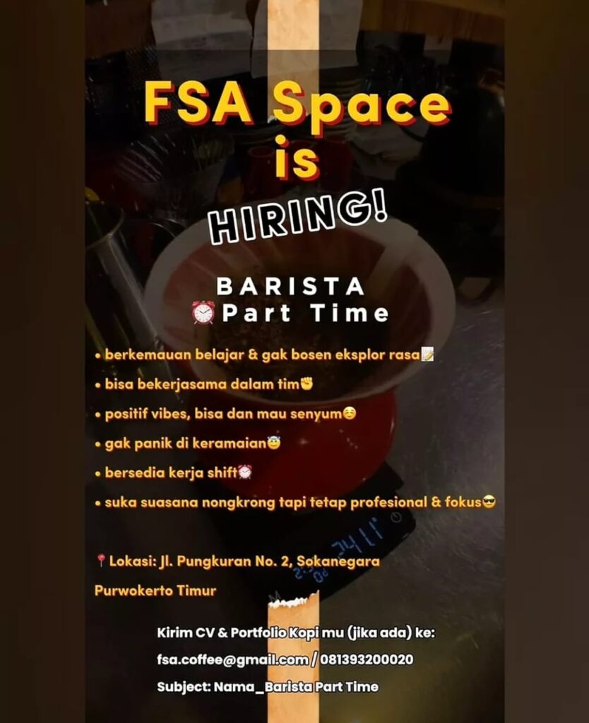 ☕ FSA Space lagi buka lowongan! Kami mencari Barista Part Time buat kamu yang: ✨ Mau belajar & suka eksplor rasa 🤝 Bisa kerja dalam tim 😊 Punya vibes positif & ramah 😌 Tetap tenang di keramaian ⏰ Siap kerja shift 😎 Suka suasana nongkrong tapi tetap profesional 📍 Lokasi: Jl. Pungkuran No. 2, Sokarnegara, […]