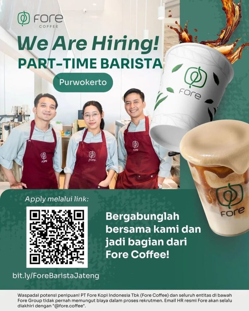 Fore Coffee Purwokerto lagi buka lowongan Part-Time Barista! Buat kamu yang suka dunia kopi, ramah, dan siap belajar, yuk gabung bareng tim Fore! ☕🤝 📍 Lokasi: Purwokerto 🔗 Daftar sekarang: bit.ly/ForeBaristaJateng Jadi bagian dari perjalanan seru Fore Coffee dan kembangkan pengalamanmu di dunia F&B!