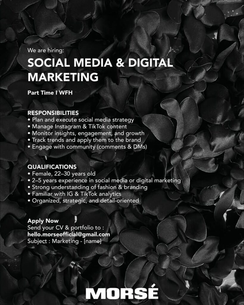 Part Time | WFH RESPONSIBILITIES Plan and execute social media strategy Manage Instagram & TikTok content Monitor insights, engagement, and growth Track trends and apply them to the brand Engage with community (comments & DMs) QUALIFICATIONS Female, 22–30 years old 2–5 years experience in social media or digital marketing Strong understanding of fashion & branding […]