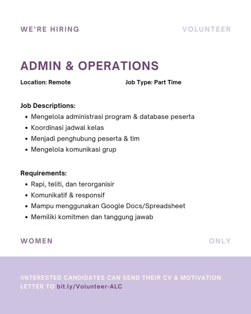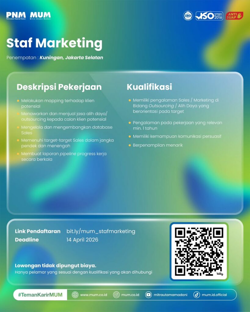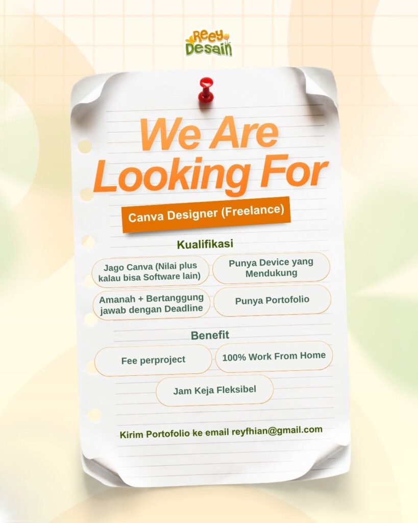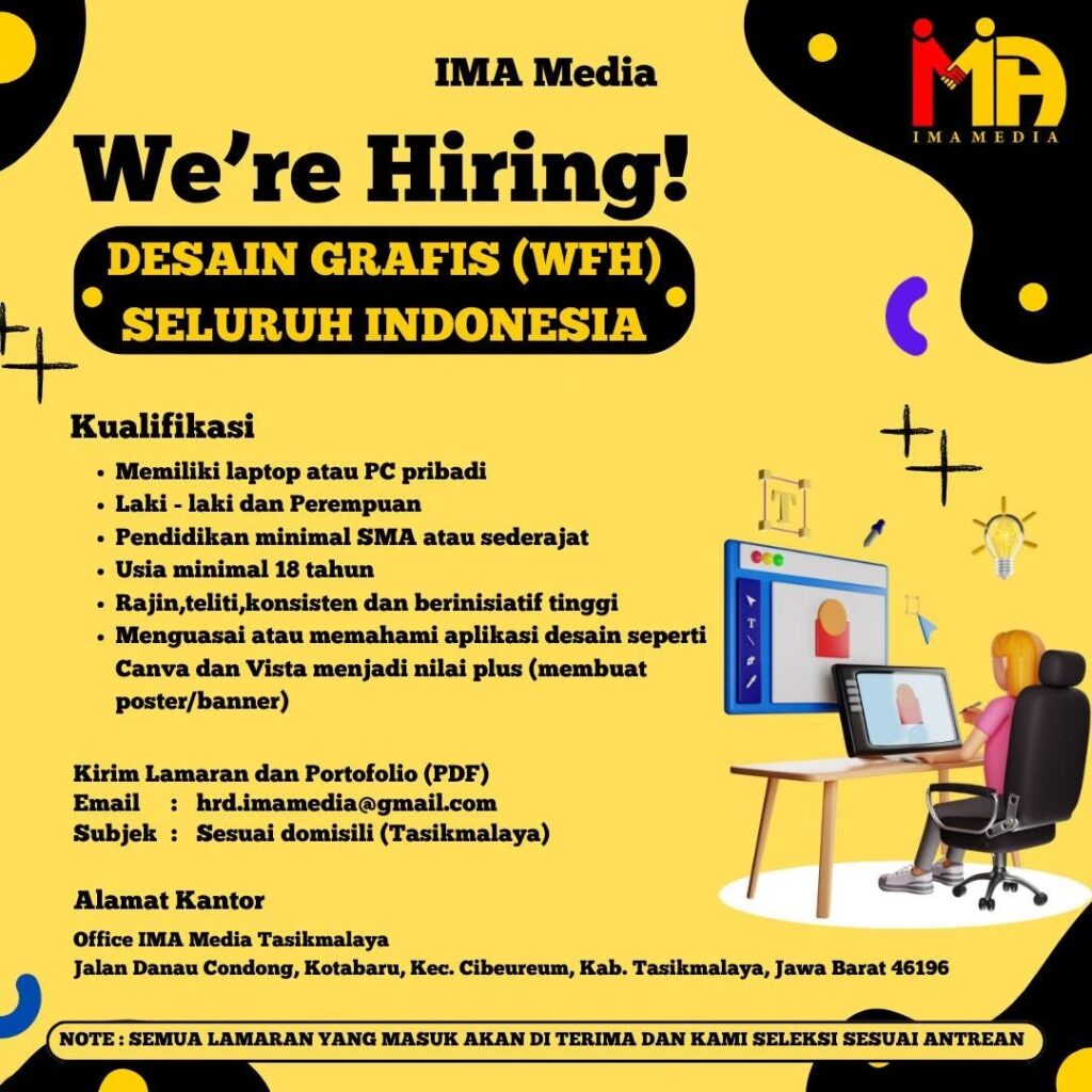IMA Media We’re Hiring! DESAIN GRAFIS (WFH)SELURUH INDONESIA Kualifikasi• Memiliki laptop atau PC pribadi• Laki-laki dan Perempuan• Pendidikan minimal SMA atau sederajat• Usia minimal 18 tahun• Rajin, teliti, konsisten dan berinisiatif tinggi• Menguasai atau memahami aplikasi desain seperti Canva dan Vista menjadi nilai plus (membuat poster/banner) Kirim Lamaran dan Portofolio (PDF)Email : hrd.imamedia@gmail.comSubjek : Sesuai […]