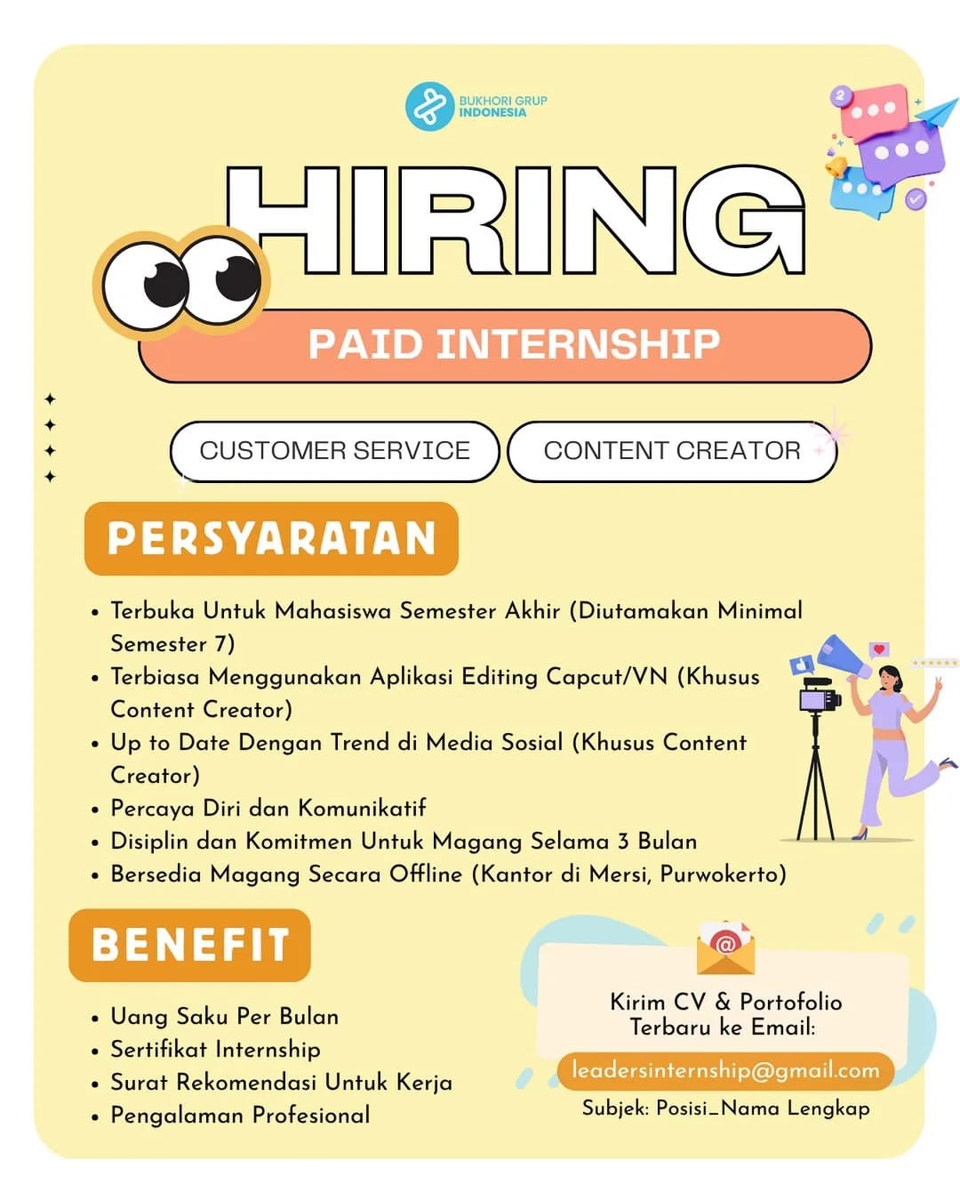 ✨ Bukhorii Grup Indonesia sedang membuka paid internship untuk posisi Customer Service dan Content Creator! 🚀 Buat kamu yang masih kuliah dan ingin dapat pengalaman