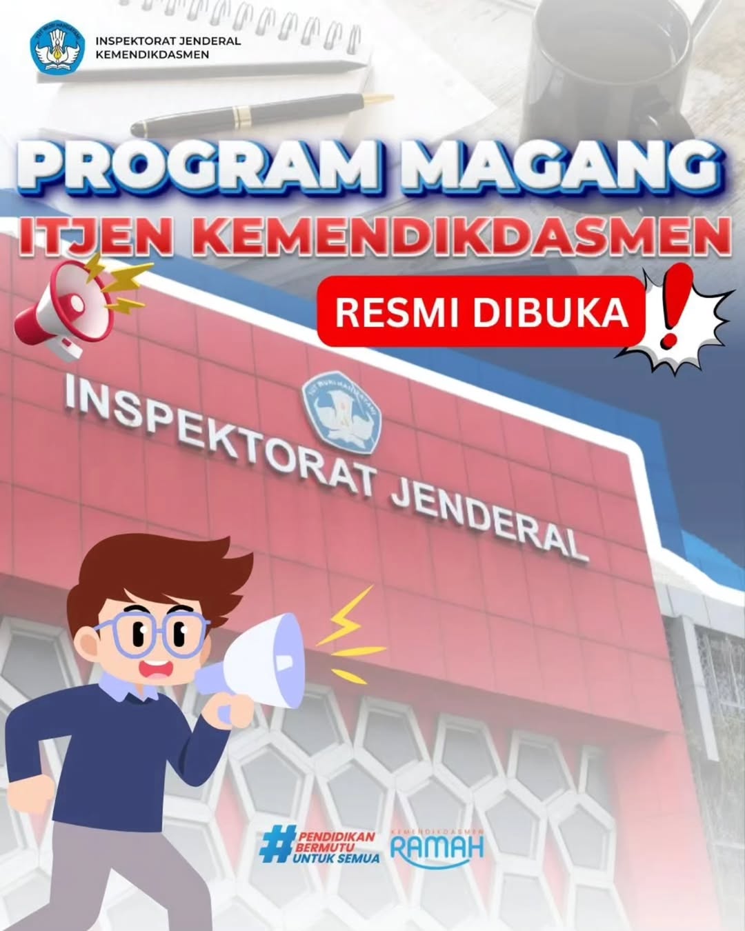 Mahasiswa minimal Semester 5 dari SEMUA JURUSAN kini punya peluang untuk magang fulltime selama minimal 3 bulan di Inspektorat Jenderal Kemendikdasmen. Tersedia berbagai bidang yang