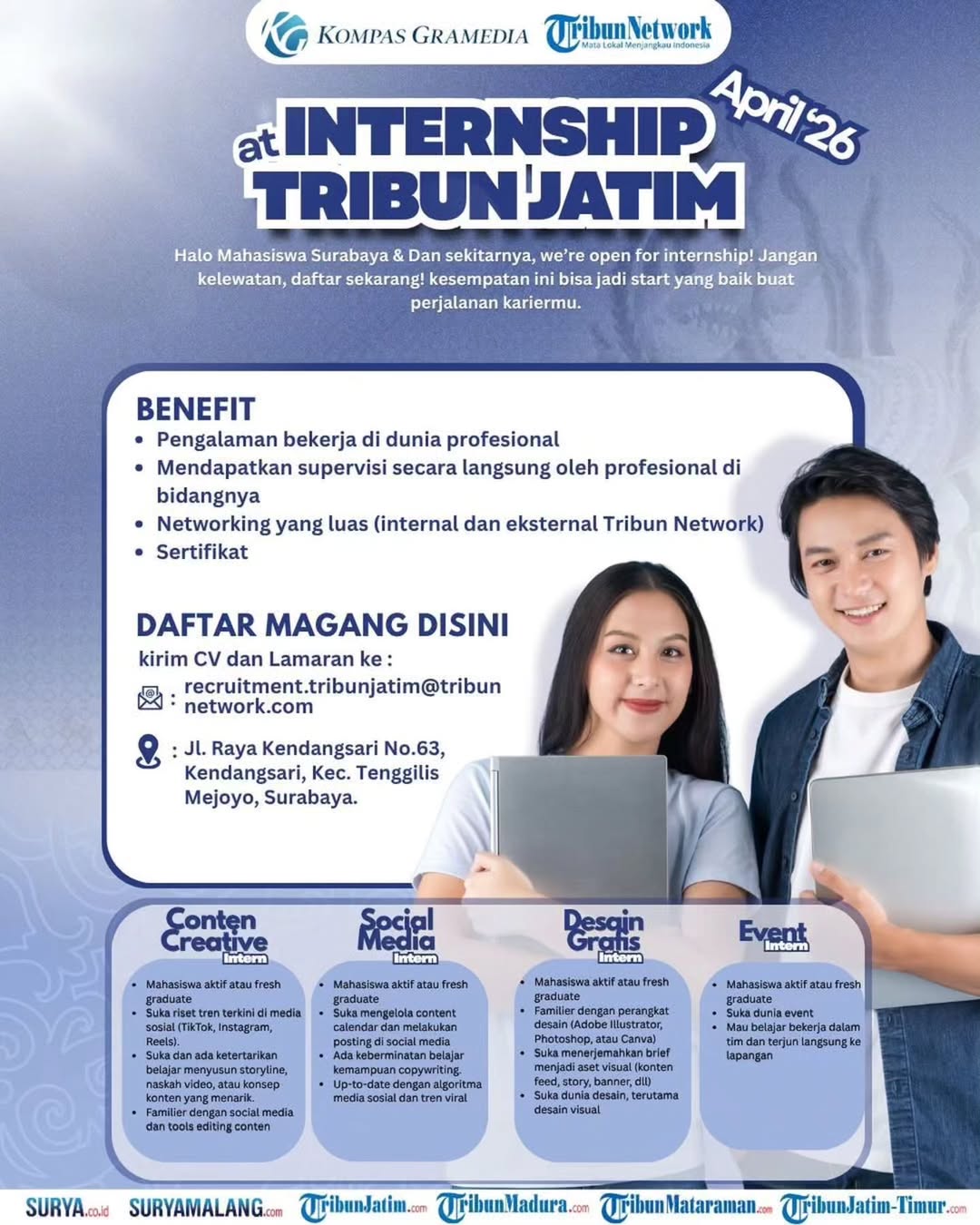 Lagi cari tempat magang yang nggak cuma “fotokopi dokumen” tapi beneran terjun ke lapangan? Pas banget, Tribun Jatim lagi buka lowongan Internship buat kamu pelajar aktif atau freshgraduate!