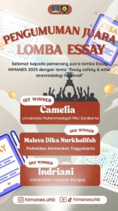 Melalui Lomba Esai HIMANES 2025, diharapkan mahasiswa Sarjana Terapan Keperawatan Anestesiologi dapat terus mengasah kemampuan menulis ilmiah, menumbuhkan semangat berpikir kritis, serta berperan aktif sebagai generasi muda yang membawa perubahan positif di dunia kesehatan. Kegiatan ini menjadi bukti bahwa mahasiswa anestesi tidak hanya ahli dalam praktik klinik, tetapi juga mampu melahirkan gagasan dan pemikiran yang membangun.