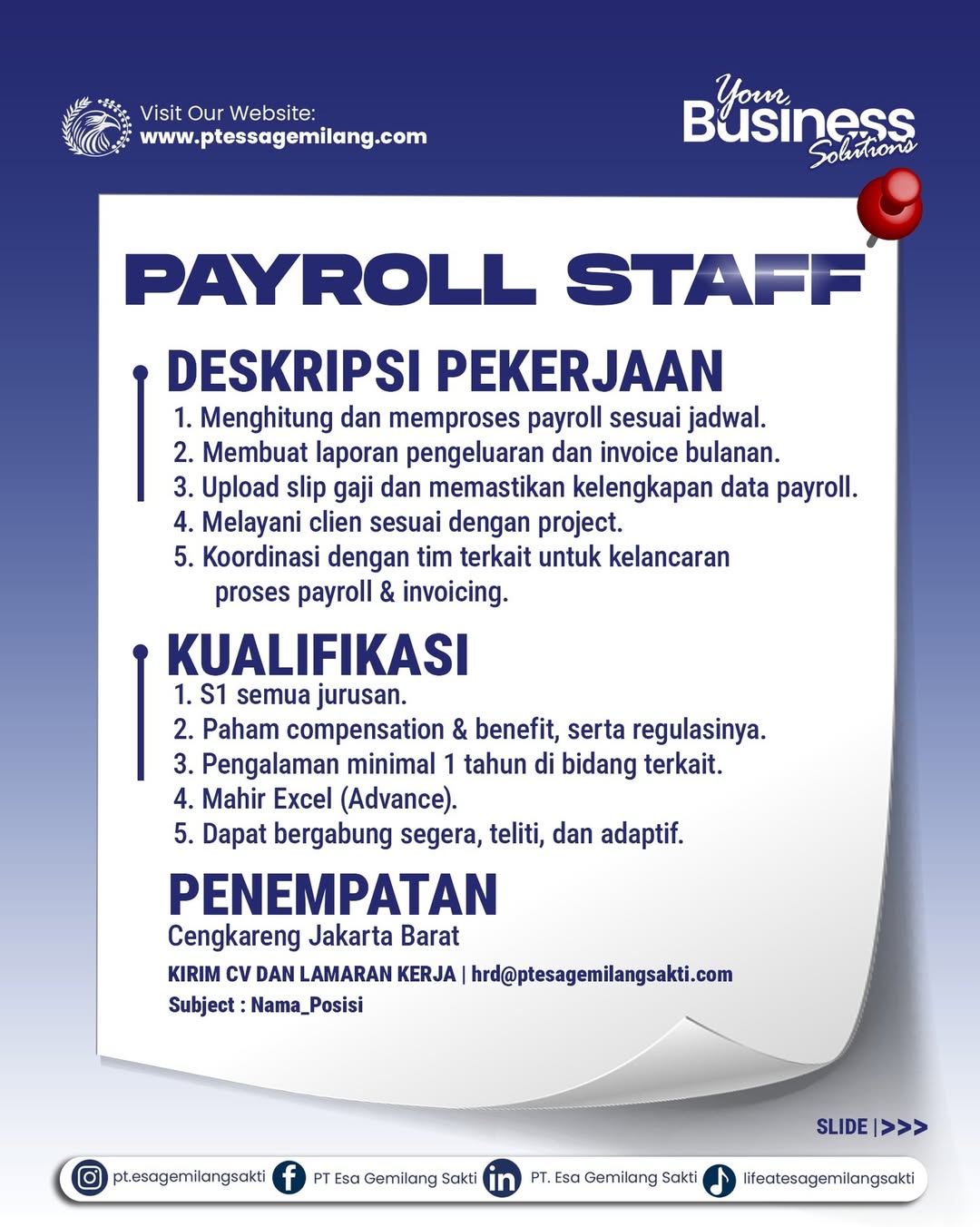 Koordinasi dengan tim terkait untuk kelancaran proses payroll & invoicing.