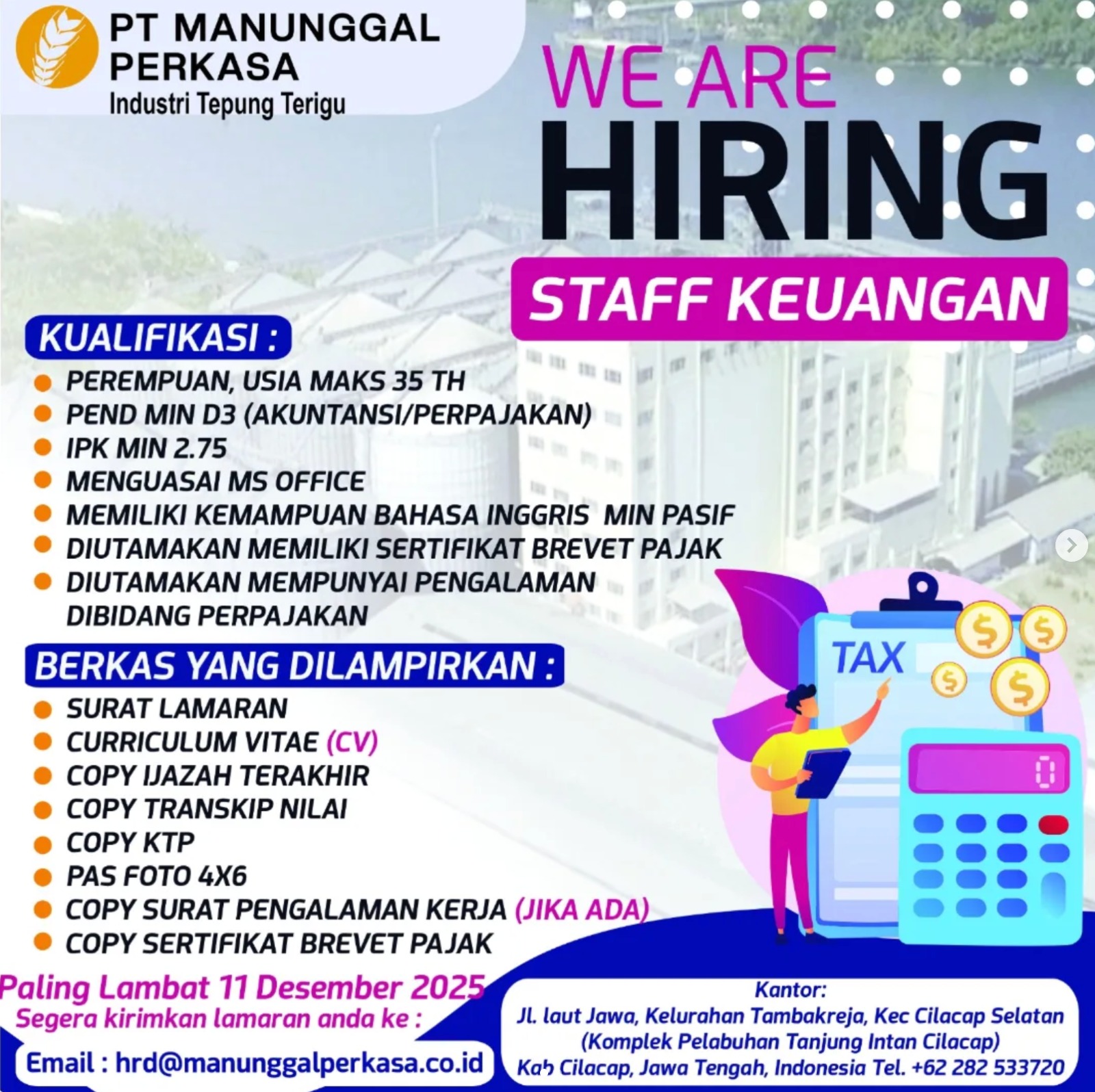 PT Manunggal Perkasa (Industri Tepung Terigu – Cilacap) membuka kesempatan untuk posisi: